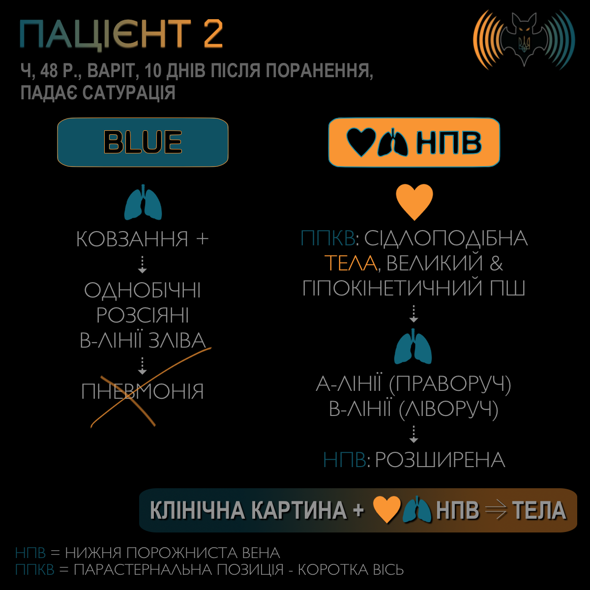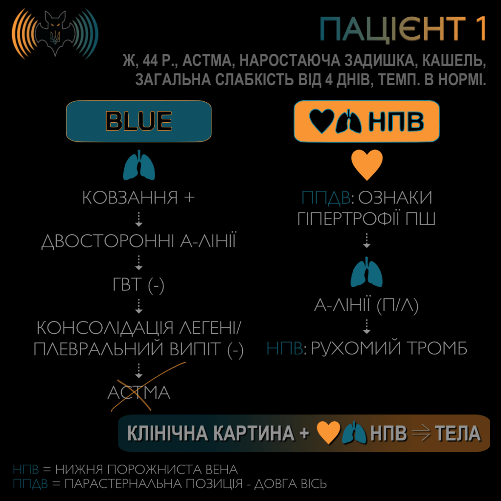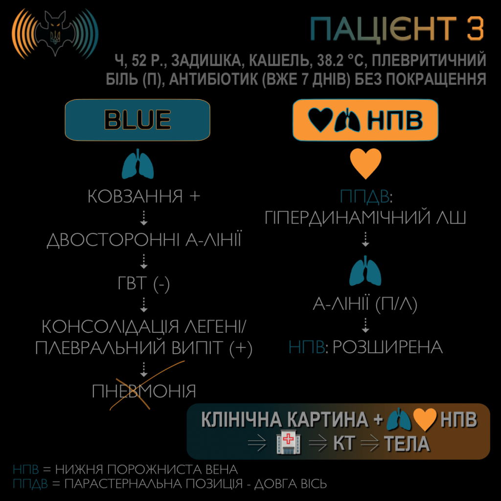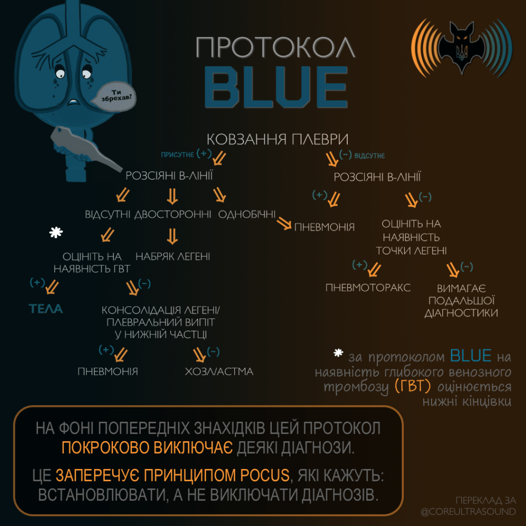 Проблема в тому, що BLUE порушує один із базових принципів POCUS. На фоні BLUE формується покроковий алгоритм виключення діагнозів, тоді як POCUS має використовуватися для підтвердження візуалізованої патології. Що стосується ТЕЛА, BLUE відкидає цей діагноз лише на підставі відсутності тромбозу глибоких вен нижніх кінцівок. З позиції невідкладної медицини це є принципово хибною логікою. Усі ми знаємо, що тромб може локалізуватися у венах верхніх кінцівок, перебувати «в транзиті», або вже бути фіксованим у легеневому судинному руслі — як з ознаками гемодинамічних порушень, так і без них.