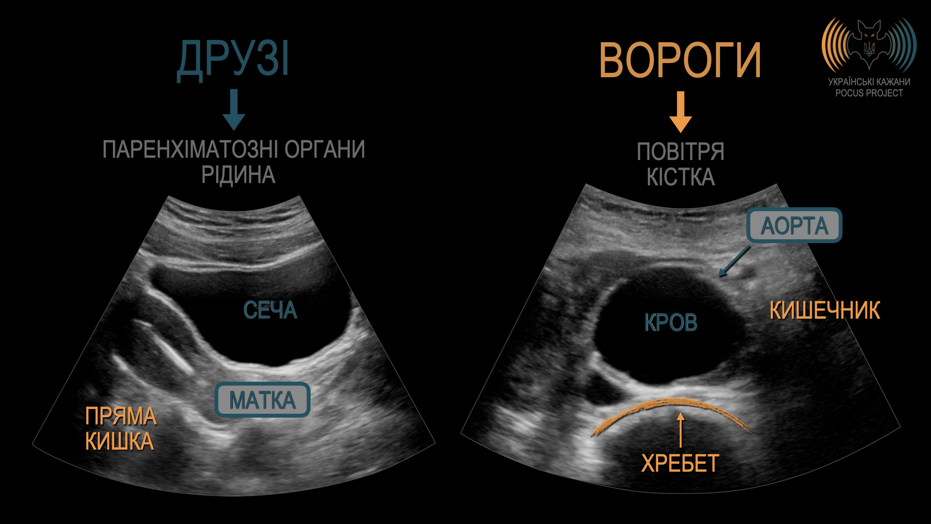 ДРУЗІ: Рідина та паренхіматозні органи (тобто тканини з високим вмістом рідини) — наші найкращі друзі. Саме тому ми використовуємо їх як ультразвукові вікна, що дають можливість бачити структури, розташовані позаду. У наведеному прикладі: міхур (заповнений сечею), матка, та аорта (заповнена кров’ю) — усе це полегшує процес візуалізації.