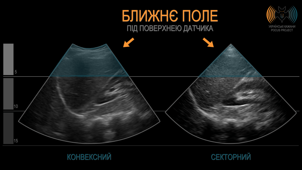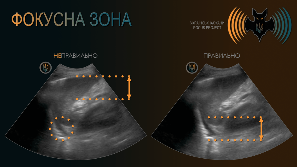 ФОКУС (FOCUS): Хоча більшість POCUS-пристроїв не мають окремої кнопки для регулювання фокуса, про нього варто згадати. Якщо спростити, фокальна зона УЗ-променя — це ділянка з найкращою роздільною здатністю, тобто там, де зображення є найбільш точним. Наприклад, уявімо, що ви виконуєте FAST-скан у гемодинамічно нестабільного (гіпотензивного) пораненого. На зображенні ліворуч фокус встановлений у ближньому полі, тоді як вас насправді цікавить сіра на вигляд ділянка в дальньому полі. Ви змінюєте положення фокуса — і тепер ця ділянка виглядає чорною. Завдяки цій, здавалося б, незначній зміні ви щойно діагностували вільну рідину в черевній порожнині, а вашому пацієнтові терміново потрібен хірург. Також варто зазначити, що багато портативних POCUS-пристроїв автоматично коригують фокус під час зміни глибини.