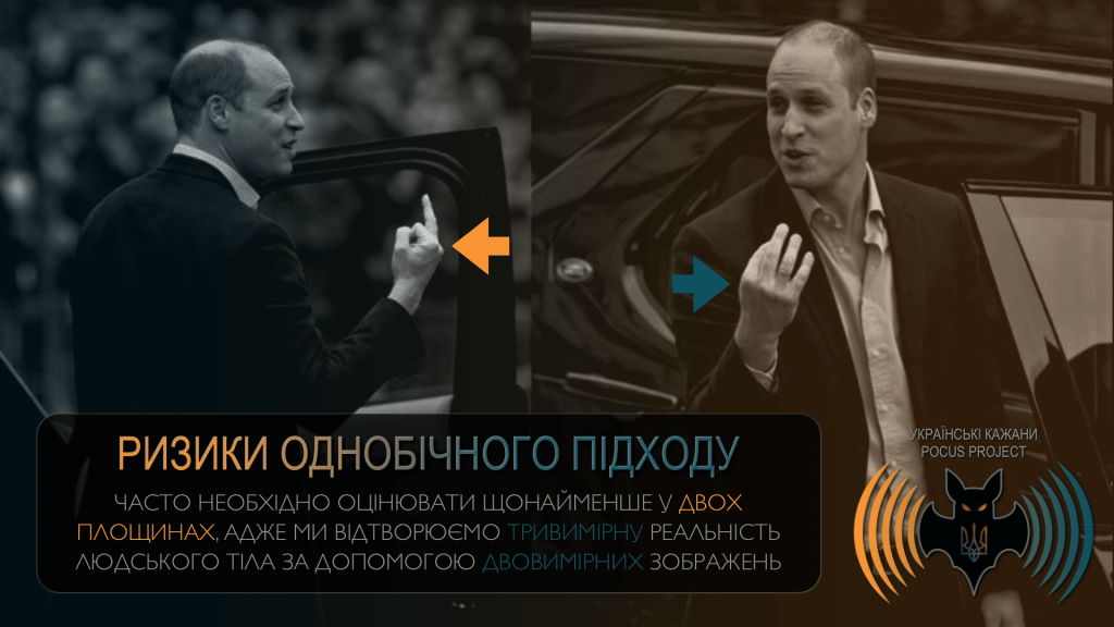 Те, що ми бачимо лише в одній проєкції, не завжди дає повну картину. Тому рекомендовано підтверджувати ультразвукові знахідки щонайменше у двох площинах. Оскільки ж ми відтворюємо тривимірну реальність у вигляді серії двовимірних зображень, необхідно просканувати датчиком усю клінічно релевантну зону.