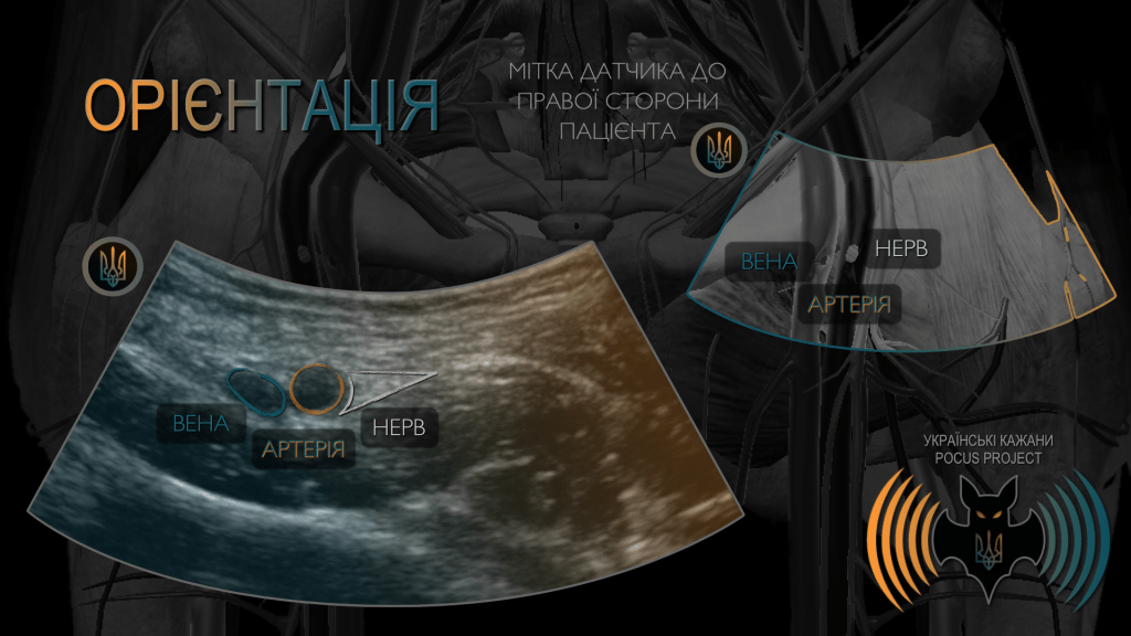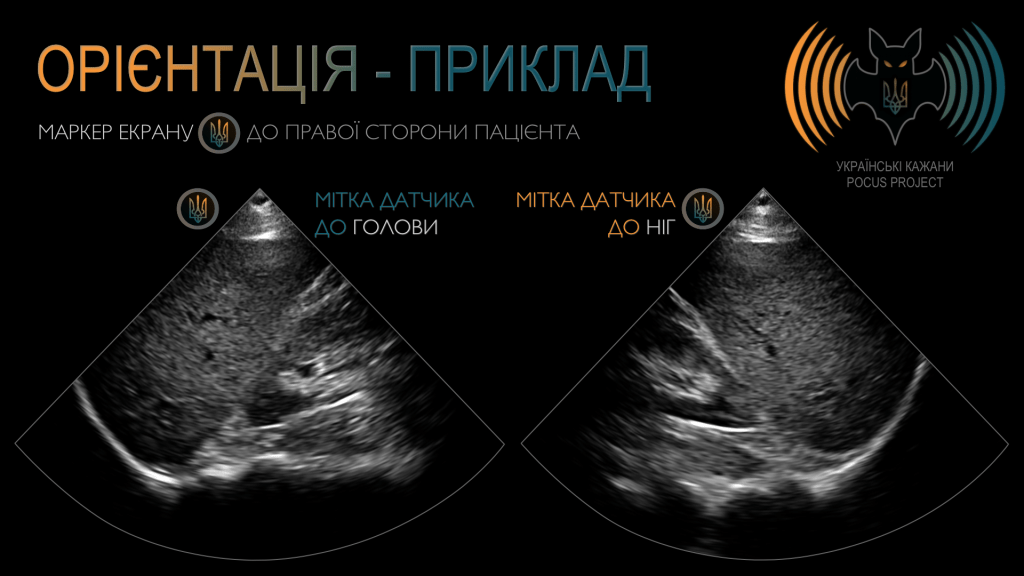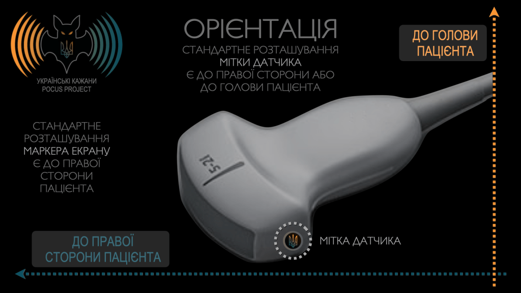 Щоб коректно орієнтуватися в анатомії пацієнта, ми використовуємо мітку датчика у співвідношенні з маркером екрана. За загальноприйнятою домовленістю (з кількома винятками) мітка датчика має бути спрямована у бік голови або правої сторони пацієнта. Важливо чітко розуміти, як положення датчика корелює з тим, що відображається на екрані. Ми завжди повинні перевіряти орієнтацію маркерів, щоб уникнути помилок інтерпретації. Це має особливе значення під час виконання інвазивних процедур під ультразвуковим контролем. Щоб запобігти пошкодженню анатомічних структур, необхідно чітко уявляти очікувану траєкторію будь-якого інструмента, зокрема гострого, всередині тіла пацієнта.