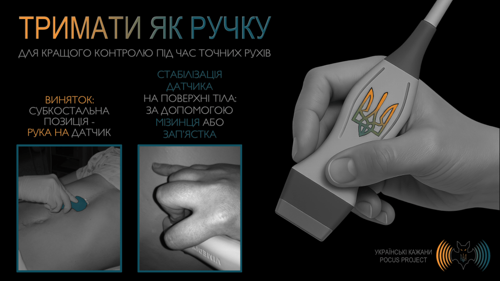 Загалом датчик слід тримати як ручку, ближче до його «голови». Якщо тримати його занадто близько до «хвоста» (тобто надто далеко від поверхні шкіри пацієнта), навіть незначні рухи призводять до надмірного зміщення. У результаті втрачається точний моторний контроль, що унеможливлює оптимізацію ультразвукового зображення. Крім того, руку треба стабілізувати за допомогою п’ятого пальця (мізинця) або зап’ястка, спираючись на поверхню тіла пацієнта. Це є критично важливим під час виконання процедур під ультразвуковим контролем, а також при візуалізації структур, на які не можна чинити тиск (наприклад, ока).