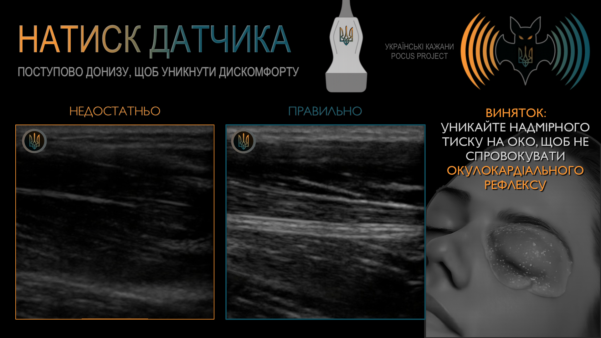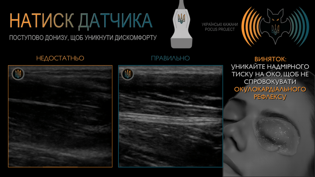 Не забуваймо про застосування рівномірного тиску датчиком донизу. Поступове його збільшення допомагає уникнути дискомфорту пацієнта. І щоб уточнити: педіатрична концепція «imaging gently» («ніжного зображення») стосується насамперед мінімізації іонізуючого випромінювання, а не техніки УЗД. Достатній тиск датчиком залишається необхідним і в педіатричному УЗ-дослідженні. Але існує кілька винятків із цього правила, найважливішим з яких є УЗД ока. Якщо ми підозрюємо розрив очного яблука, виконання POCUS є абсолютно протипоказаним; водночас надмірного тиску датчиком на очне яблуко слід уникати за будь-яких обставин. Це може потенційно спровокувати окулокардіальний рефлекс (OCR), що проявляється брадикардією, артеріальною гіпотензією, нудотою та (рідко) аритміями. Також слід утримуватися від надмірного тиску в ділянці шиї — зокрема над сонними судинами. Стимуляція каротидного синуса може викликати виражену вагусну відповідь із розвитком брадикардії, гіпотензії або навіть (пре)синкопального стану. Якісна стабілізація руки та використання великої кількості гелю допомагають запобігти цим ускладненням.