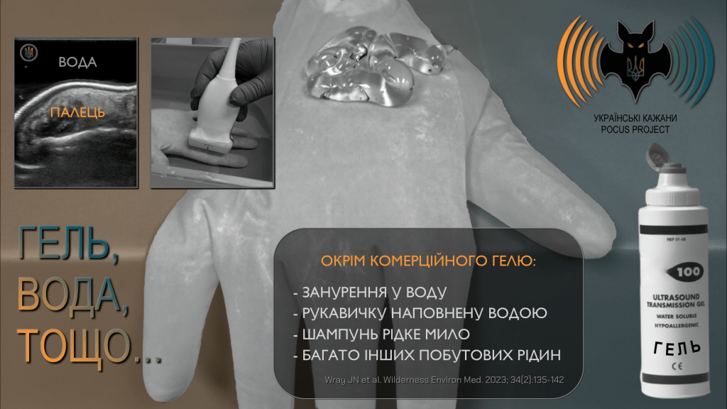 Використання достатньої кількості гелю є абсолютно необхідним, оскільки повітря між датчиком і шкірою погіршує якість зображення. Повітря та ультразвук не є «друзями». Коли скануємо невеликі структури, менші за ширину датчика (наприклад, пальці), може виникнути потреба занурити їх у водяну ванну або використати підкладку. Комерційні гелеві «подушки» є дорогими, проте їх легко замінити рукавичками, наповненими водою. Натомість я не рекомендую використовувати пакети з фізіологічним розчином як імпровізовані підкладки, оскільки їхня пластикова оболонка є занадто товстою для отримання якісного зображення. Аналогічну проблему під час POCUS серця можуть створювати й грудні імплантати.