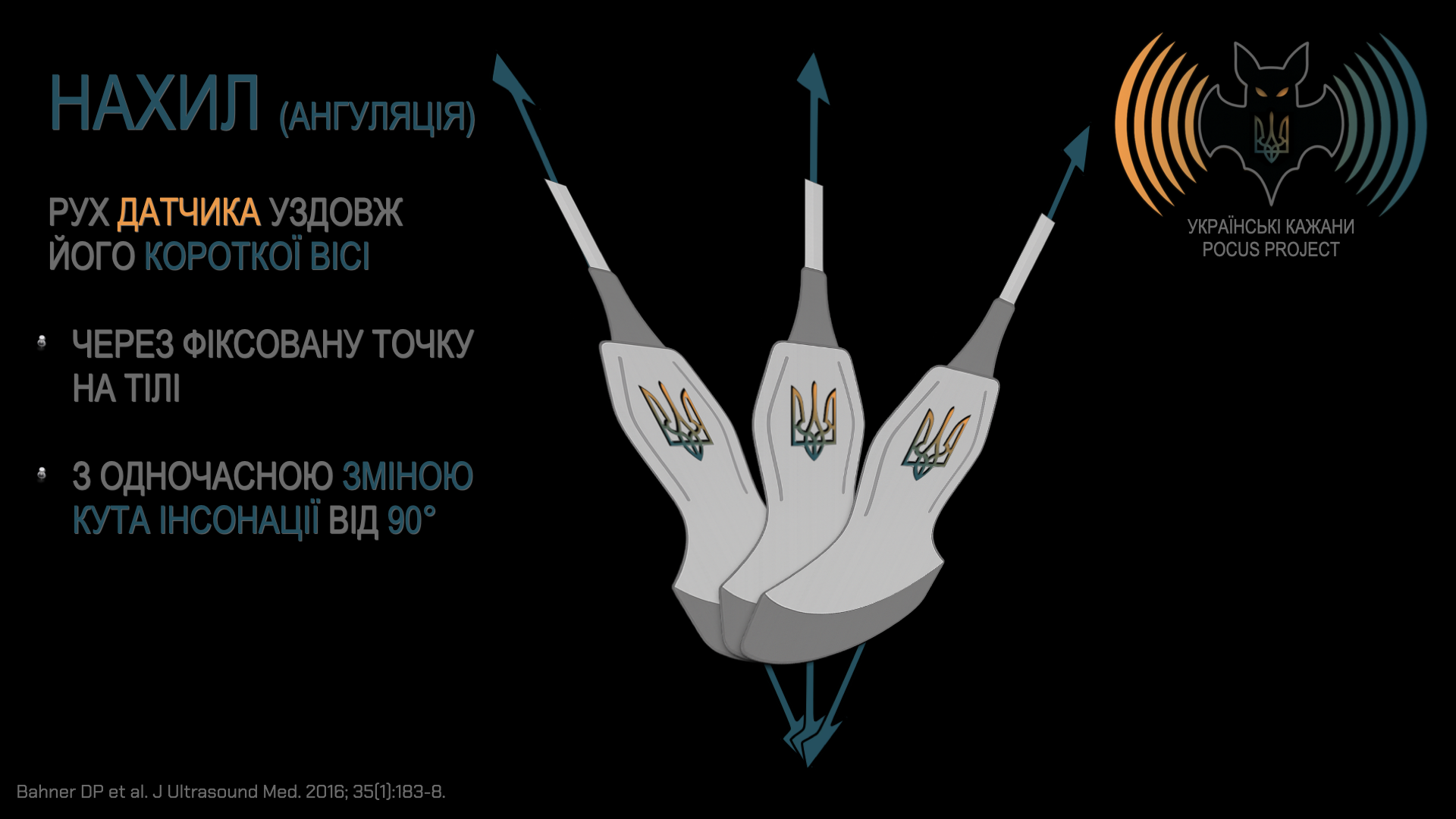 На початку ми порівняли датчик з анатомічним ліхтариком. Він дозволяє нам оглядати внутрішні структури пацієнта, не розрізаючи тканин. Переміщення датчика лише на перший погляд здаються хаотичними. Насправді використовується низку стандартизованих рухів, щоб оптимізувати зображення та відтворювати тривимірну реальність за допомогою двовимірних зображень.