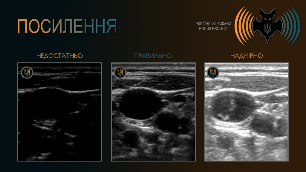 ПОСИЛЕННЯ (GAIN): це своєрідна «кнопка гучності» для зображення. Якщо встановити посилення занадто низьким, зображення виглядатиме темним і потрібних структур не видно. Якщо ж посилення занадто високе, зображення стає майже яскраво-білим, а на екрані з’являються штучні відбиті сигнали («примарні» ехо-сигнали), які можуть маскувати справжню анатомію або імітувати патологію. У прикладі на зображенні: видно нібито тромб у судині, але насправді це лише надмірне посилення. Після корекції «псевдотромбоз» зникає. Для початківців досить типовим є встановлення посилення на надто високому рівні, проте з набуттям досвіду ця помилка трапляється значно рідше.