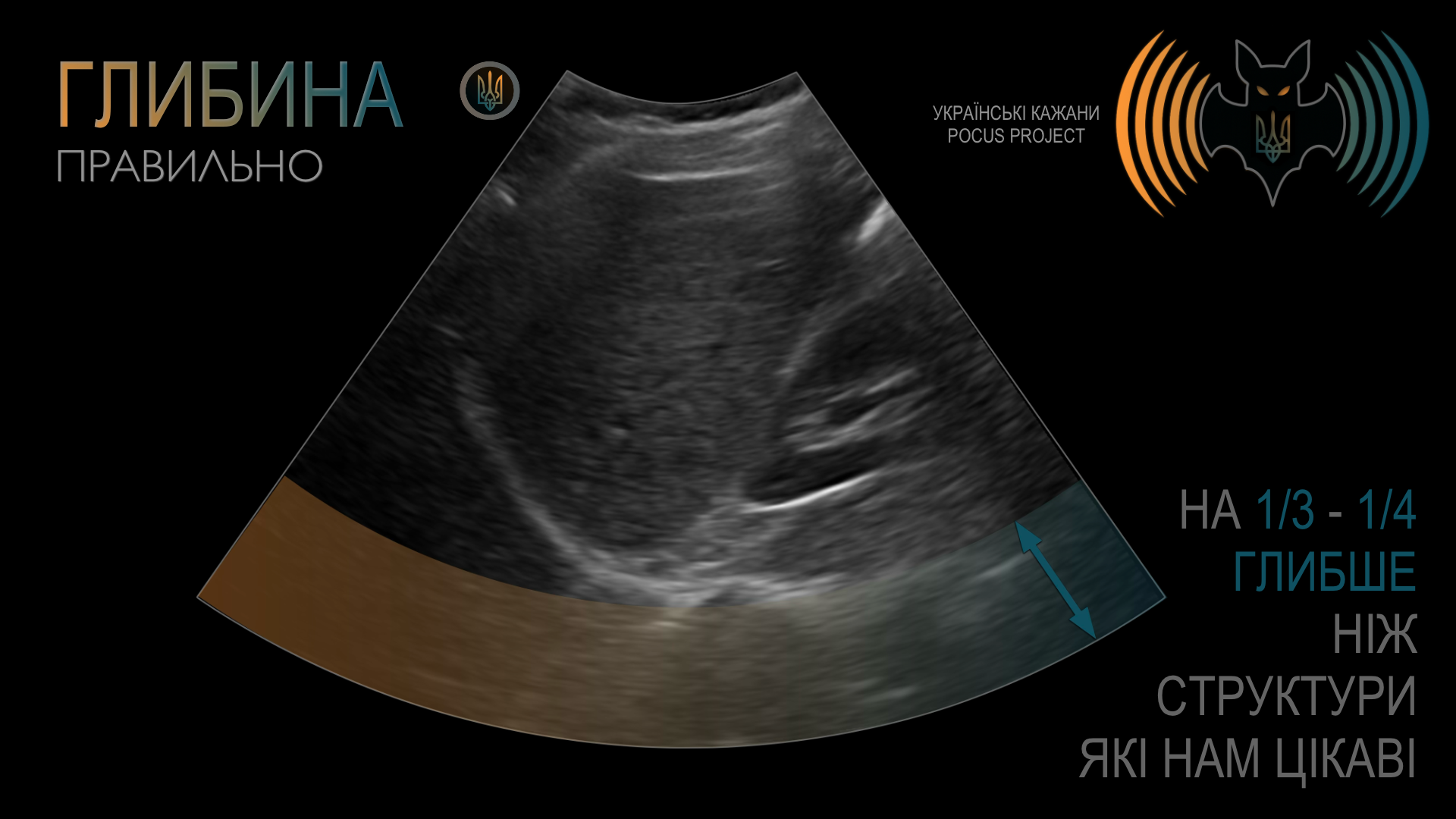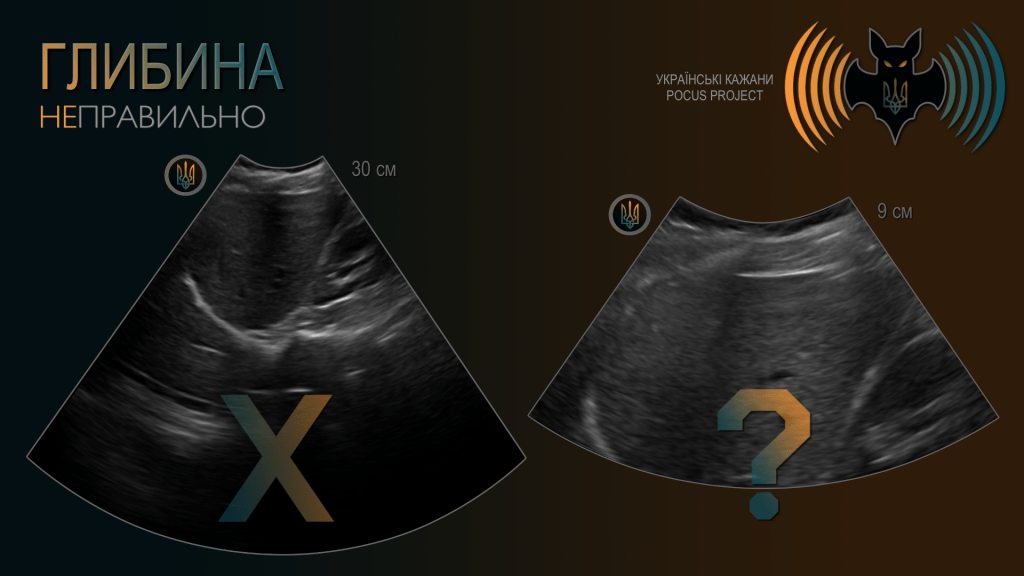 ГЛИБИНА (DEPTH): Поняття глибини є досить очевидним. Якісне зображення не повинно мати більшу частину екрана, зайняту структурами без клінічного значення. Водночас поганою звичкою є встановлення глибини таким чином, що за досліджуваною структурою не залишається жодного вільного простору. Найкраще починати з надмірної глибини та поступово зменшувати її, а не навпаки — з надто малої глибини з ризиком пропустити важливі знахідки. Загалом рекомендовано, щоб приблизно третина або чверть екрана залишалася за межами ділянки, яку ви оцінюєте.