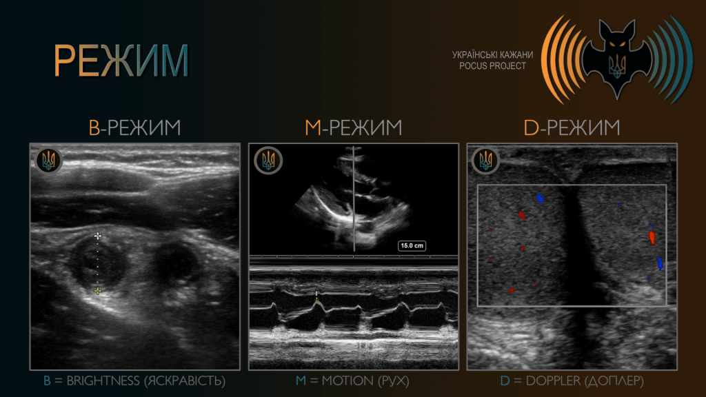 - B-режим (B-mode) — більшість обстежень виконується саме в B-режимі (brightness mode). У B-режимі відображається фактичний ультразвуковий вигляд даної структури.