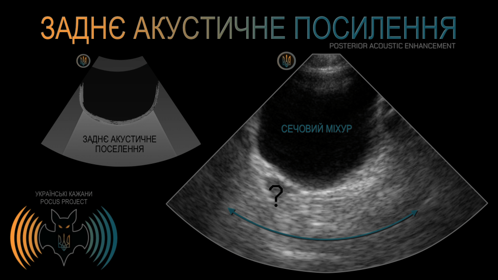 ЗАДНЄ АКУСТИЧНЕ ПОСИЛЕННЯ: коли ультразвуковий сигнал проходить через ділянки з низьким ослабленням, зокрема через рідину, він виглядає посиленим у дистальних відділах за цією структурою. Візьмімо як приклад наповнений сечовий міхур: тканини, розташовані глибше від нього, виглядають дуже яскравими. У травмованого пацієнта це може призвести до пропуску патологічної вільної рідини позаду міхура, яку не слід плутати з сім’яними міхурцями (один із них тут позначений «?»). У такій ситуації, за технічної можливості, слід зменшити посилення у дальньому полі зображення. Саме через цей артефакт у структурах наповнених рідиною, товщину стінки завжди вимірюємо по передній, а не по задній стінці.