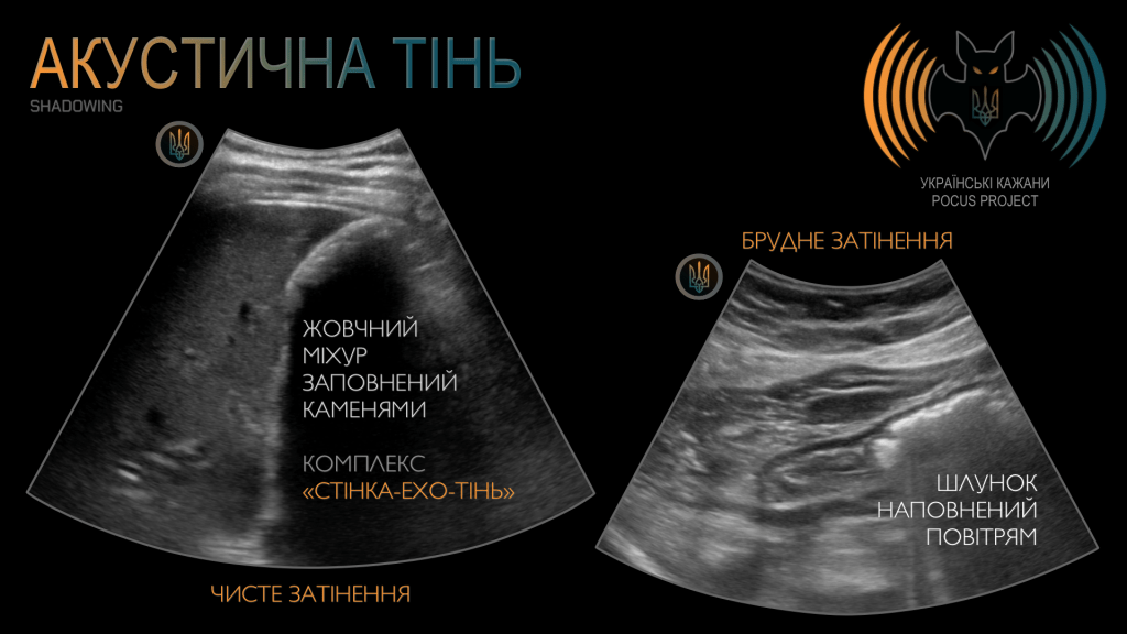 АКУСТИЧНА ТІНЬ виникає тоді, коли сигнал проходить через ділянки з високим ослабленням, зокрема через кальцифіковані структури. Хоча тінь від кісток зазвичай не допомагає, той самий артефакт, спричинений, наприклад, жовчними каменями, може бути надзвичайно інформативним. Іноді саме він є єдиною підказкою, що вказує на наявність біліарних конкрементів. Затінення від кальцифікованих структур класифікується як «чисте» — воно є анехогенним (чорним) та має чітко окреслені межі. Також ми можемо спостерігати «брудне» затінення, спричинене структурами, заповненими газом або повітрям. Воно виглядає як своєрідна «димова завіса» — ехогенна, з розмитими краями.