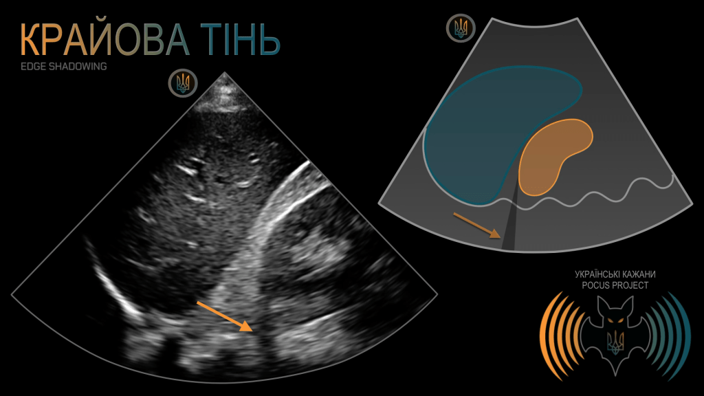 КРАЙОВА ТІНЬ: важливий артефакт, зумовлений рефракцією, тобто відхиленням ультразвукового променя від траєкторії, якою він «мав би» поширюватися. Слід пам’ятати, що УЗ-сигнал не завжди рухається прямолінійно. Таке відхилення найчастіше виникає, коли УЗ-промінь потрапляє на поверхню криволінійного відбивача, наприклад нирки, жовчного міхура або кровоносної судини. Іноді цей артефакт помилково інтерпретують як вільну рідину. У нашому прикладі видно артефактну чорну лінію, що тягнеться прямо від округлого полюса нирки. Звернімо увагу, що вона перетинає кілька анатомічних площин, яких вільна внутрішньочеревна рідина фізично не може досягти. Анатомічного сполучення з черевної порожнини через заочеревинний простір і далі за хребет не існує.