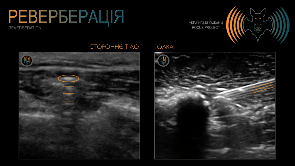 РЕВЕРБЕРАЦІЯ: ще один поширений артефакт, який виникає тоді, коли УЗ-сигнал багаторазово відбивається між двома сильними відбивачами. У результаті на екрані з’являється характерна «сходинкоподібна» картина з паралельних ехо-сигналів. Ми часто спостерігаємо цей артефакт в УЗД легені (A-лінії є паралельними відбиттями плеври). Водночас реверберацію можна використовувати й на нашу користь — наприклад, під час локалізації сторонніх тіл або виконання процедур під УЗ-контролем.