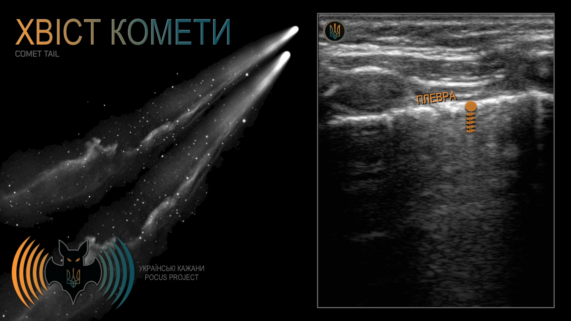 ХВІСТ КОМЕТИ: це ревербераційний артефакт, який виглядає як короткий, яскравий «хвіст» ехо-сигналів, що відходить від високо відбивної межі. Він виникає тоді, коли УЗ-промінь «захоплюється» між двома щільно розташованими поверхнями та багаторазово між ними відбивається. З кожною реверберацією імпульс, що повертається до датчика, стає значно слабшим і швидко згасає. Найчастіше цей артефакт спостерігається при ковзанні плеври (як у нашому прикладі) або на кінчику голки у доступі out-of-plane (коротка вісь).
