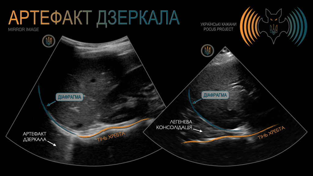 АРТЕФАКТ ДЗЕРКАЛА: виникає тоді, коли УЗ-хвиля спрямовується на дуже відбивну поверхню (наприклад, діафрагму або перикард), яка поводиться як дзеркало. УЗ-промінь спочатку досягає реальної структури, далі відбивається від дзеркалоподібної поверхні та повертається до датчика довшим шляхом. Апарат інтерпретує цей подовжений час повернення так, ніби структура розташована глибше, унаслідок чого формується дубльоване, «дзеркальне» зображення. У результаті ми можемо побачити «другу печінку» над діафрагмою або «ще одне серце» під перикардом. Таке артефактне «друге зображення печінки» в нашому прикладі не слід плутати з «гепатизацією» (консолідацією) легеневої тканини. Якщо за цією «другою печінкою» видно тінь хребта, то йдеться про патологію (консолідовану легеневу тканину або згорнуту кров). Якщо ж тіні хребта немає — це артефакт.