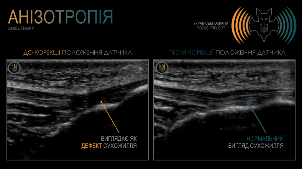 АНІЗОТРОПІЯ: це напрямкозалежний артефакт, за якого ехогенність структури змінюється залежно від кута інсонації, а не від властивостей самої тканини. Він виникає тоді, коли УЗ-промінь потрапляє на добре організовану структуру (наприклад, зв’язку, нерв або сухожилля) під кутом, що відхиляється від 90°. У результаті така структура може виглядати патологічно зміненою (гіпоехогенною), хоча насправді жодної патології немає. Після корекції кута інсонації зображення знову набуває нормального вигляду. Це поширена пастка в м’язово-скелетному POCUS і одна з основних причин хибнопозитивних діагнозів. У нашому прикладі місце прикріплення сухожилля чотириголового м’яза до надколінка незначно змінює напрямок і виглядає частково розірваним — доти, доки ми не відкоригуємо кут інсонації, гойдаючи датчиком.